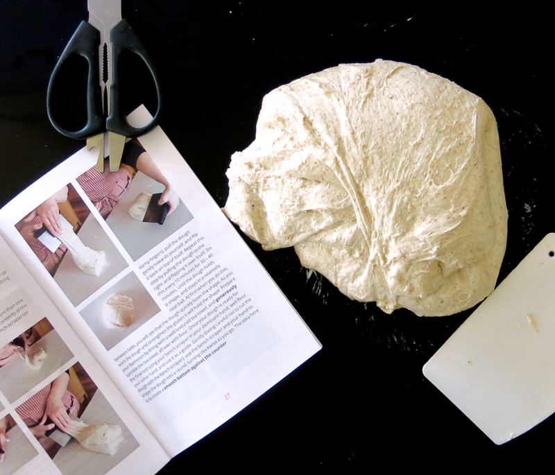 Kaelin has written a very detailed sourdough making guide with step-by-step photos that she should get published. It is brilliant and mine is tattered and torn, worn and loved, beloved, read and stained. Above, the scissors hold it open so I can read the instructions while I fold the dough.