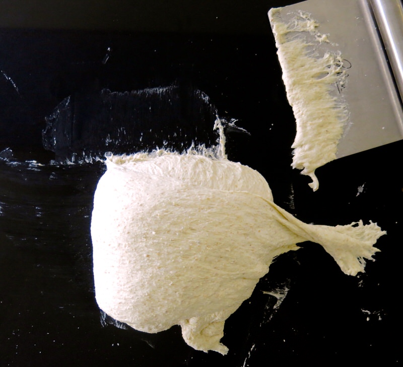 After resting, plop on a non-floured the counter or work surface. Carefully and quickly, use a D-shaped spatula (pictured below) to move the mound into a dough-ball. If placed in the fridge overnight, remove from fridge and bring to room temperature (about one hour): proceed to make the dough-ball.