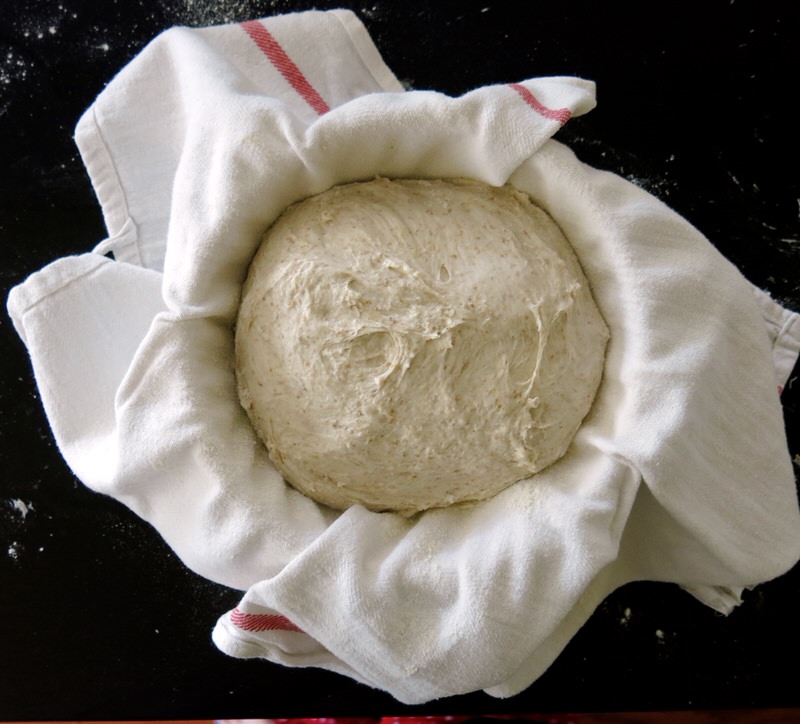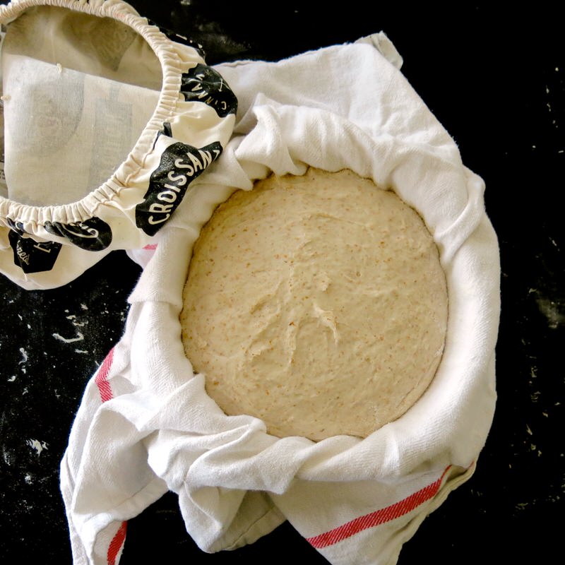 Gently cover with a tea towel. I had a lovely little cover that came in handy. Rest another one to two hours until when pressed gently with a finger, the indent remains. Before it is ready, if it has rested one entire hour at room temperature, you can also cover the banneton with dough inside in plastic and place in fridge overnight or for 8 hours and bake in the morning.