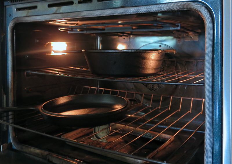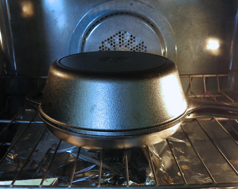 - Insert cast iron pan and lid into 500 F oven; heat all 20-30 minutes