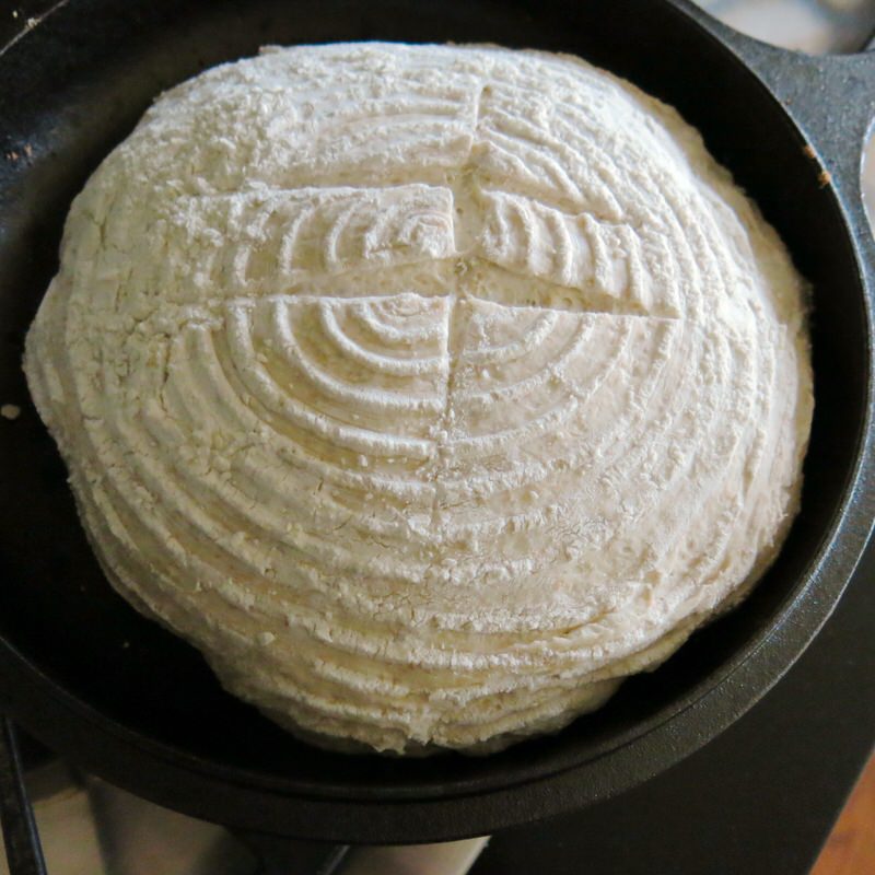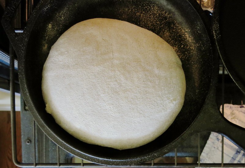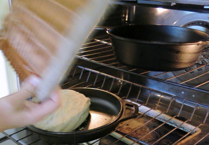 - Pull out bottom of cast iron pan; gently flip dough into it (bottom will face up)