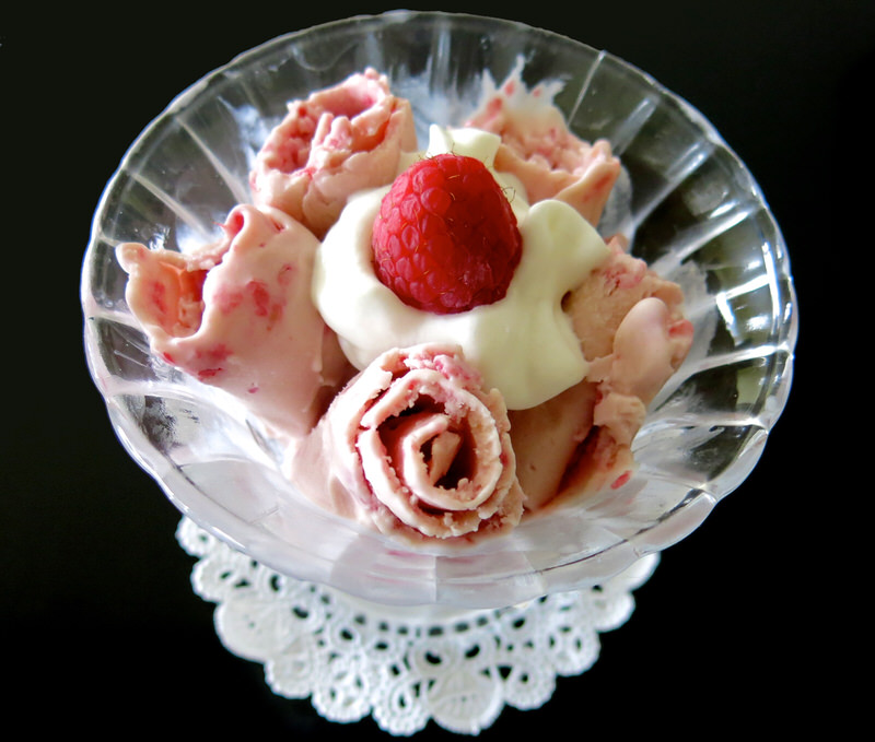 Owning your own ice plate means you can make delectable rolled creamy desserts with the best of ingredients. Above, only 3 raspberries were added to 1/4 of this base recipe, with the additional one on top, for garnish. The velvety vanilla cream custard is clearly homemade and the raspberries compliment the richness with a sparkle of tart irresistible early summer pleasure. Blessed bliss.