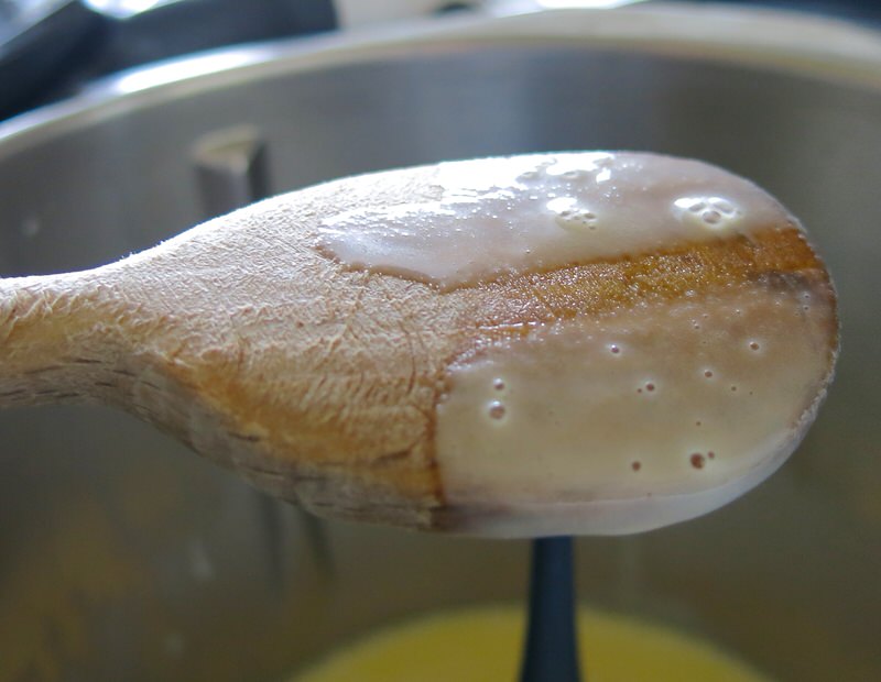 - set timer for 10 minutes at 90C speed 2; cook for 6 minutes and change temperature to 100C until mixture coats back of a wooden spoon and leaves a path where you run your finger