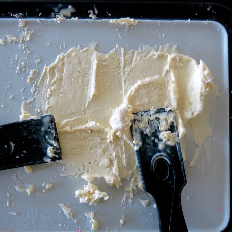 - Once flavour option is completely incorporated into cream base, spread mixture thinly and evenly over surface of ice plate