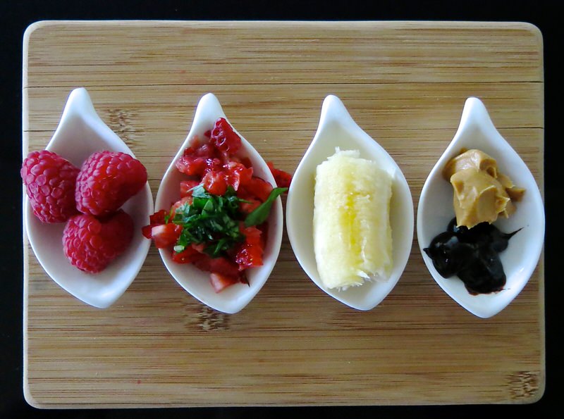 Time to play with your food and who doesn’t love to do that? I sure do! The backdrop is the vanilla cream base and the flavour profile for each 6 roll serving is completely up to your imagination, craving, personal palate or what you have provided your guests to mix together if you set up a Rolling Desserts Ice Cream Buffet! Above, left to right: raspberry, strawberry and basil, banana, peanut butter with chocolate fudge sauce. Below, left to right: cocoa, cinnamon and Matcha tea.