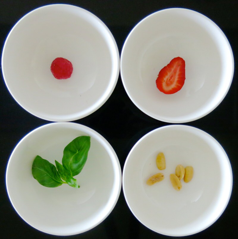 The recipe at the end of this post includes more suggestions that will ignite your imagination. The key is “less is more” and it will take a wee bit of practice to learn the ratio for custard base to flavour base. Suggested amounts are in the recipe that have worked. Below, garnish for each flavour. Whipping cream is a must and a little touch of what flavour the frozen custard holds to identify it, as a garnish, is also key – and just plain purdy!