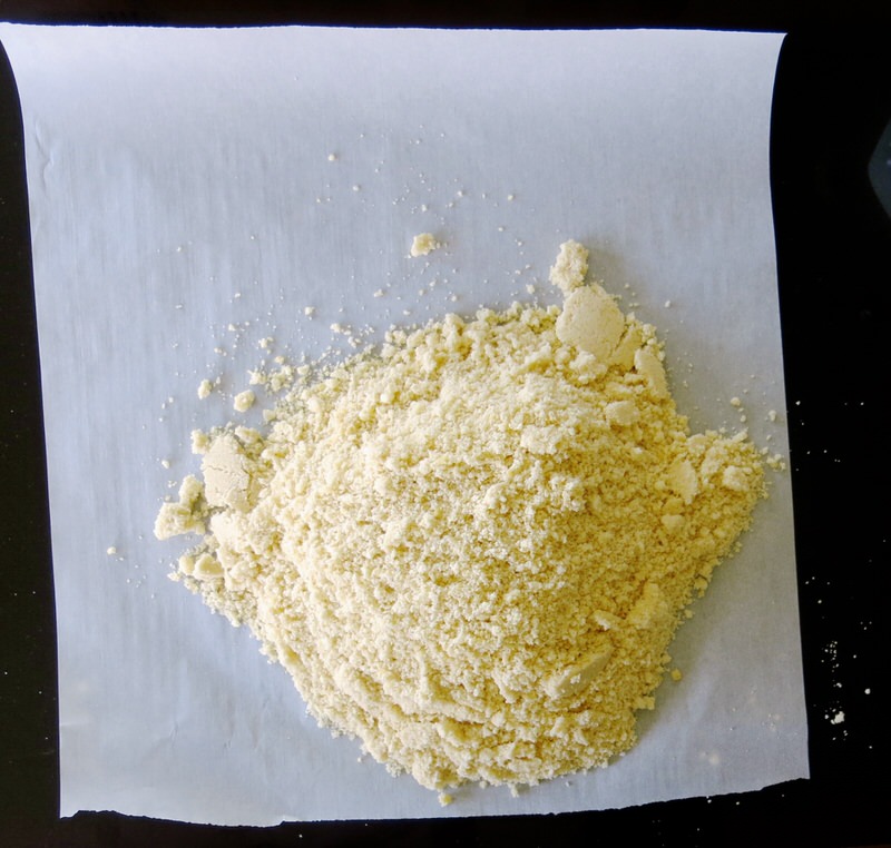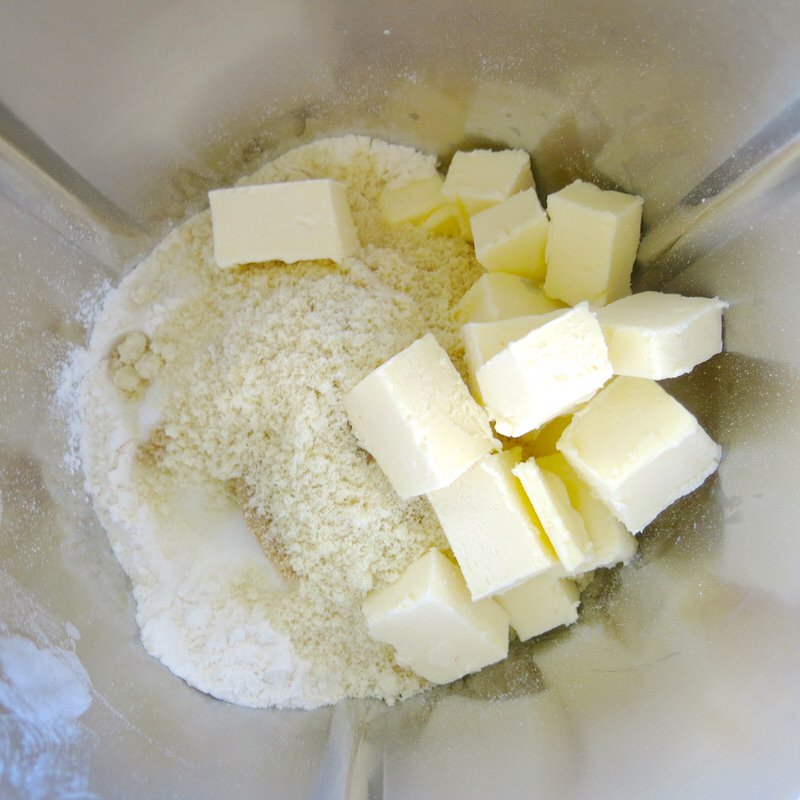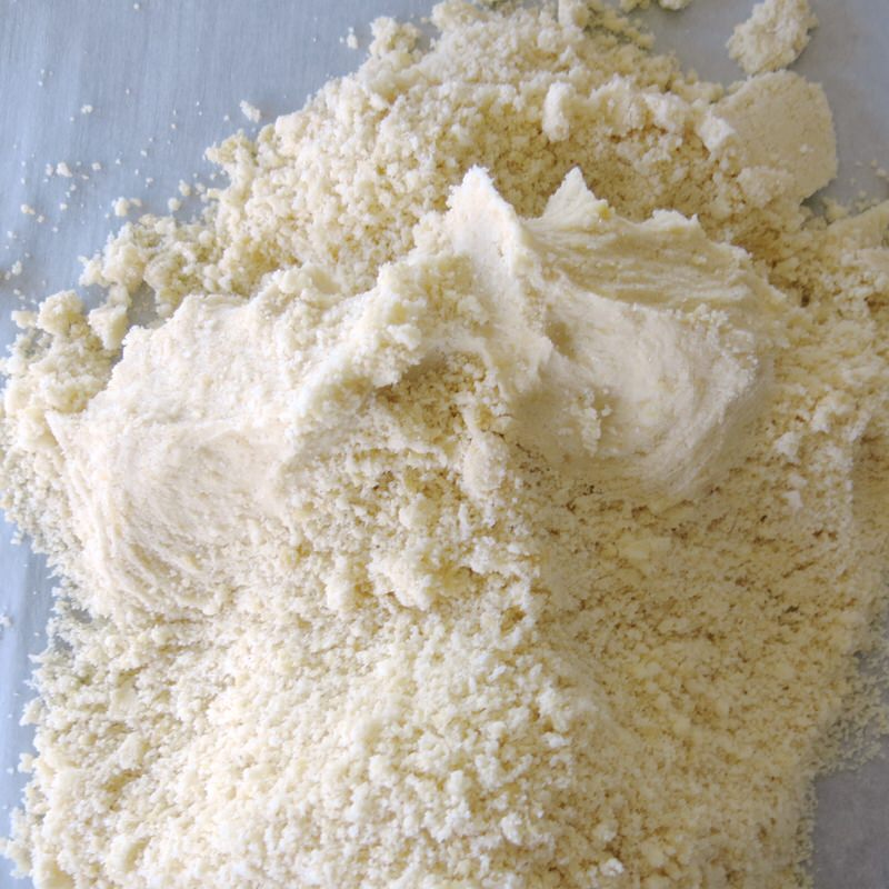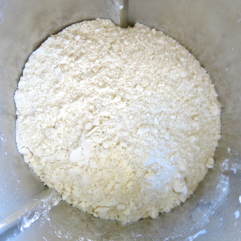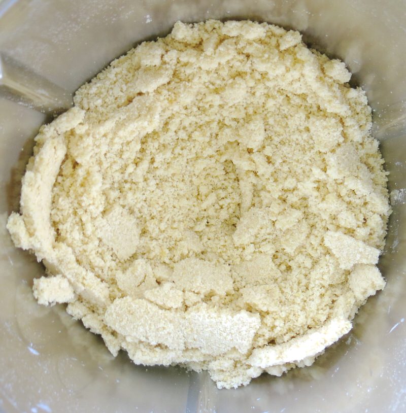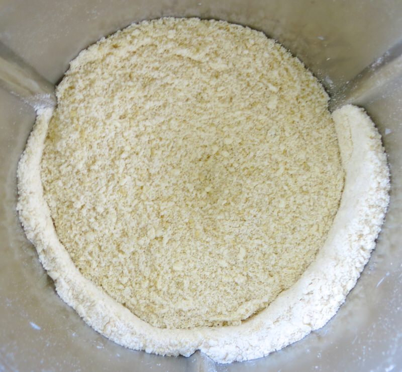 - Weigh flour, almond meal and cold butter into mixing bowl and mix on speed 5 for 10 seconds until cornmeal consistency: butter must still be visible and small pieces, about 1/4 the size of a pea