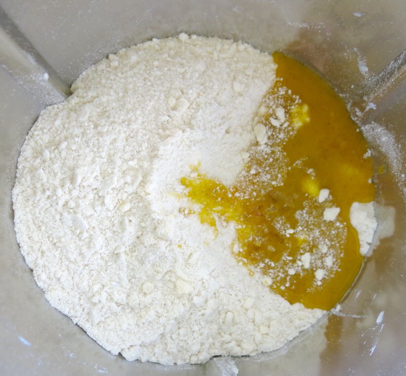 Eggs and vanilla combine and set aside. I love vanilla paste. Yes, the vanilla bean is the real deal, but until I get back to France to buy a bundle at a reasonable price, I will only be using the beans in recipes that showcase only the vanilla. The sugar is at the bottom in middle photo, already blitzed into oblivion. Flour is combined with frozen butter all combined to produce lumps about 1/4 green pea size.