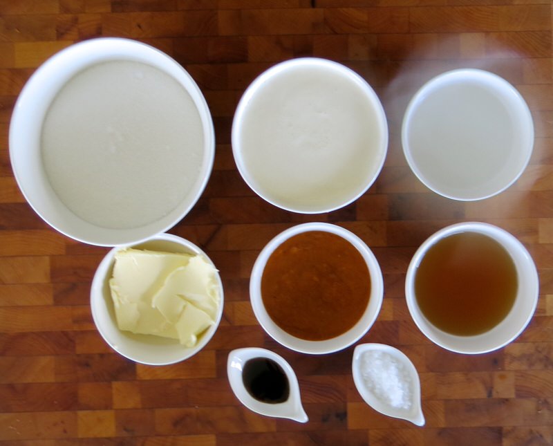 Cloudberry Caramel ingredients are simple with the exception of the Cloudberry Purée. Above, left to right: Sugar, cream, water (with an unexpected halo), butter, cloudberry purée, syrup, vanilla and salt.