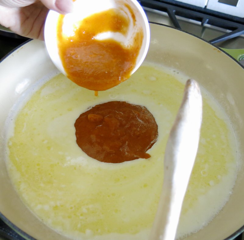 Butter melted into cream with cloudberry purée added and mixed to fully incorporate. A simple mixture that presents such an unexpected punch when combined with the caramel mixture.