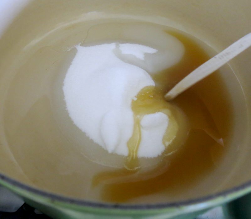 Sugar, syrup and water combined and brought to 250°F before adding in the cloudberry mixture.
