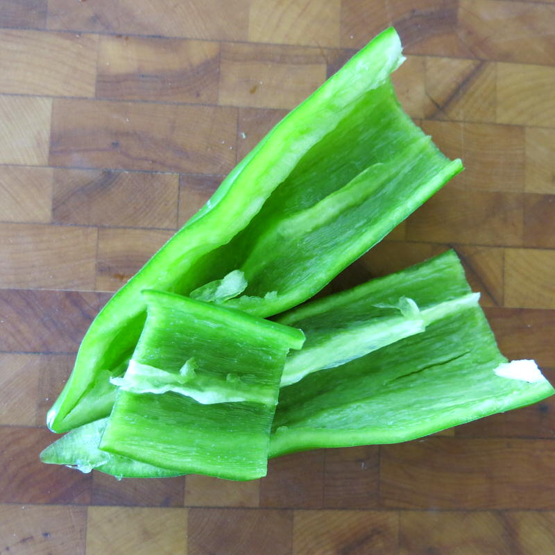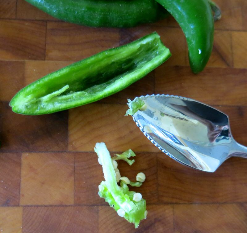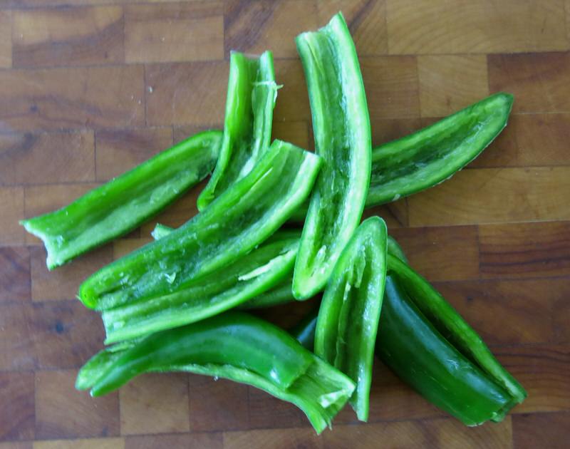 The long green Thai and short green Thai peppers are both very spicy for my palate. Thus the Anaheim in place of the long green Thai peppers. Of course, a completely different flavour, within the green pepper realm – but close enough to suit my fancy. I was sure that there was not one seed that made it into the bowl.