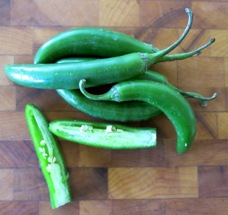 - 55 grams or 2 ounces fresh small green chilies (Serano) stems and seeds removed