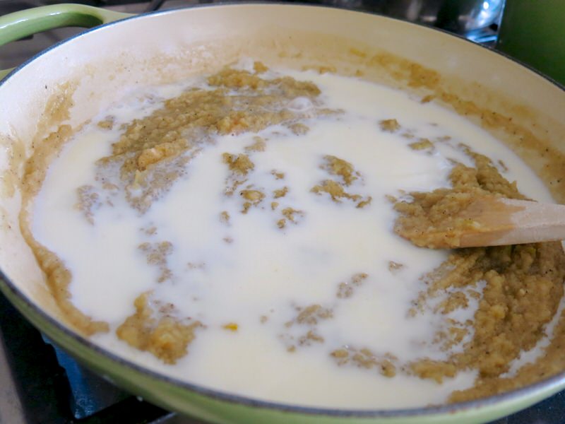 - Add liquid from filling, stirring to incorporate; add milk, but by bit, stirring constantly until a thick gravy consistency