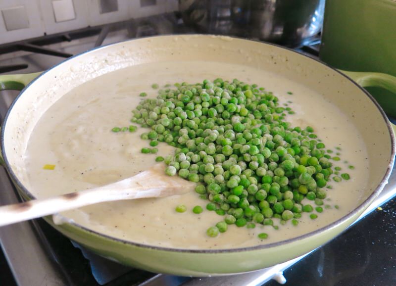 With the vegetables cooked down, there is just enough room for the white sauce and peas. A good few gentle stirs enable the sauce to fully incorporate.