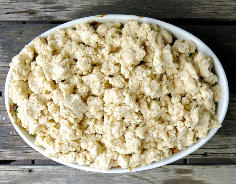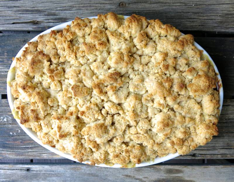 The filling is completely cooked, so into the oven until bubbly and golden brown. The biscuit dough could be rolled out and cut the shape of the dish and place on top, but I like the crumbly bits from the dollops.