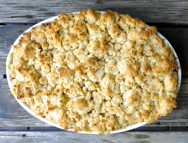 - Bake large casserole on middle rack in oven for 40-45 minutes until bubbly and topping is golden brown; set on rack to cool 15 minutes and serve with a dab of sweet butter in the middle of the biscuit topping