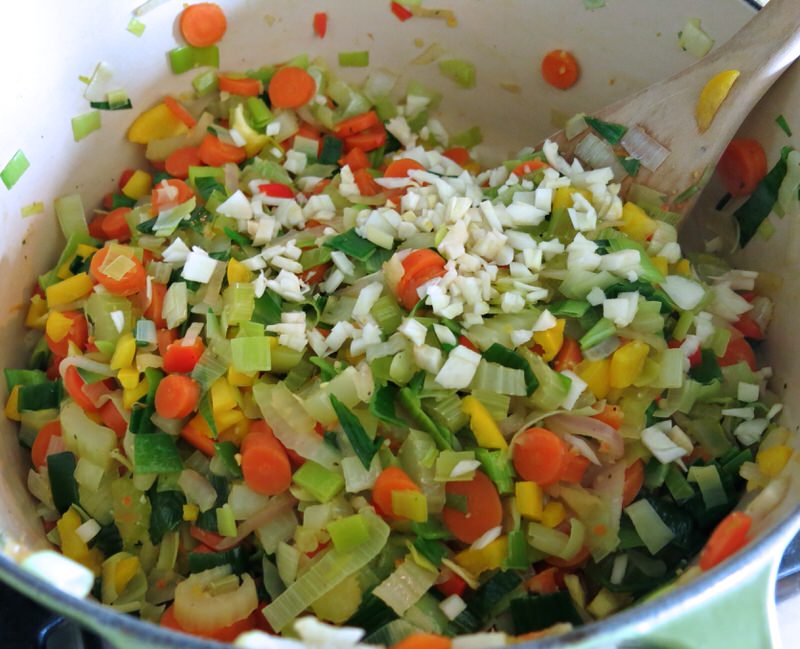 Saute the mirepoix until translucent; add garlic, peppers and mushrooms and cook until just beginning to soften.