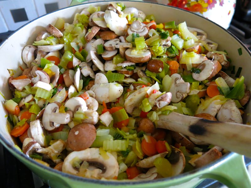 - Add garlic and mushrooms; stir while sautéing about 2-3 more minutes
