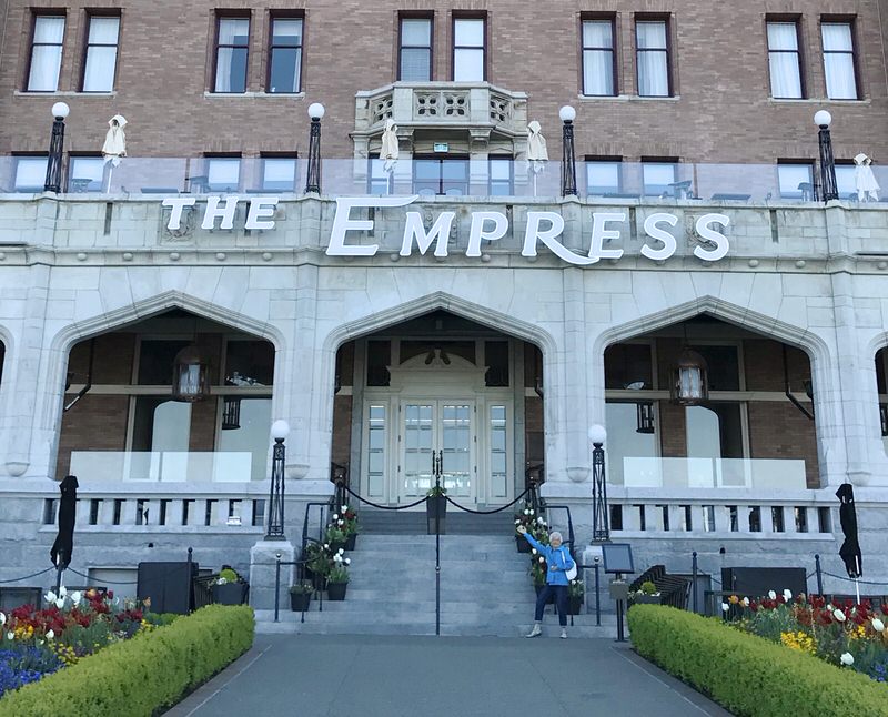 The weather was dreamy. The flowers and foliage beckoning every Albertan to move to British Columbia this time of year. We spent our morning acquainting ourselves with the city by car, then walking and shopping and lunching and browsing. Feasting our senses on every aspect of this gorgeous Vancouver Island city was spiritually edifying. Back to our rooms for a rest before our 5 pm booking for High Tea at the Empress. Above, the grand room where High Tea is served. This was once the lobby and main entrance into the hotel, directly behind the grand doors mom stood in front of, above.