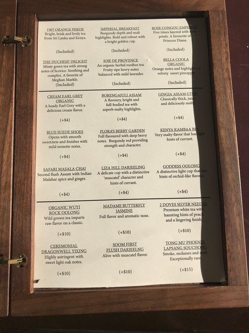 The top six were included with the price of the High Tea. Those under the line could be ordered for the additional price indicated under the description of each. We know how to treat ourselves, but we also know our limit. Any of the top six it would be. I could not decide amongst three, and hands down, the waiter directed me toward Lady Di’s favourite, the rose scented tea that is also sold in the gift shop. Mom chose “The Duchess” likely as there wasn’t a choice titled “The Queen”.