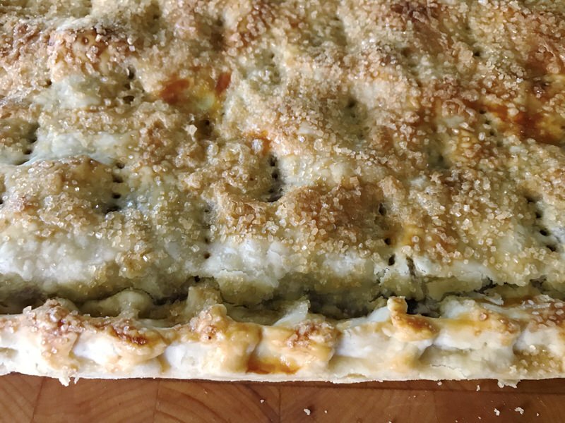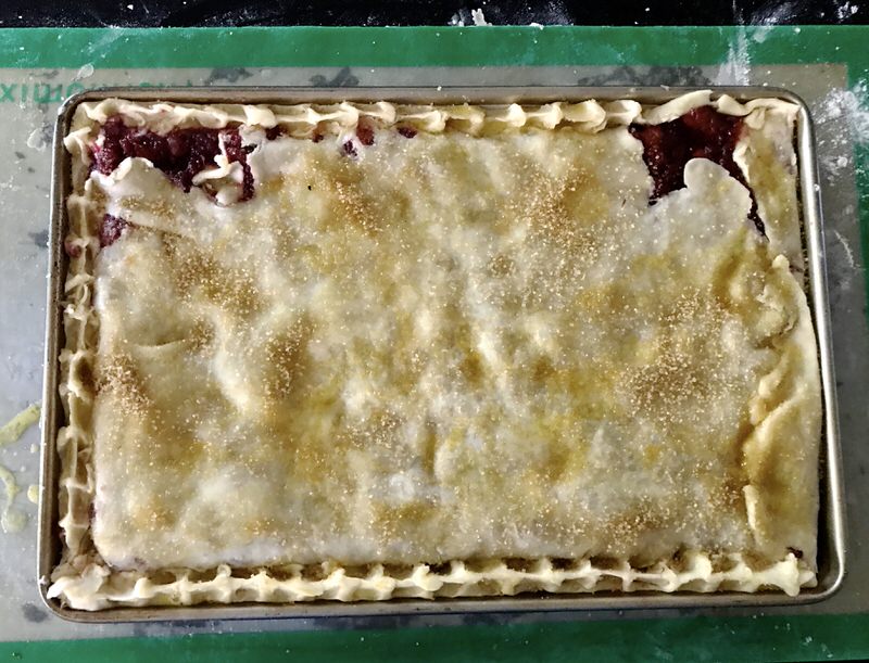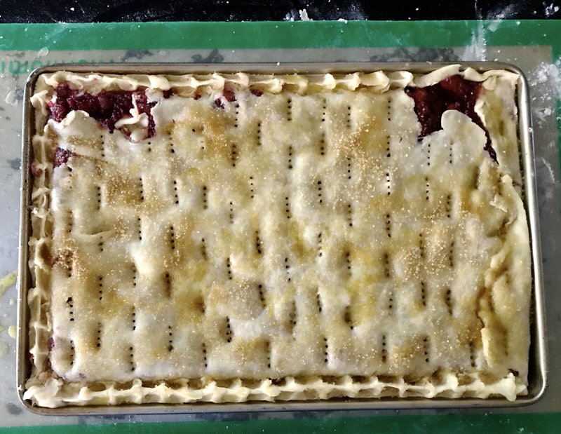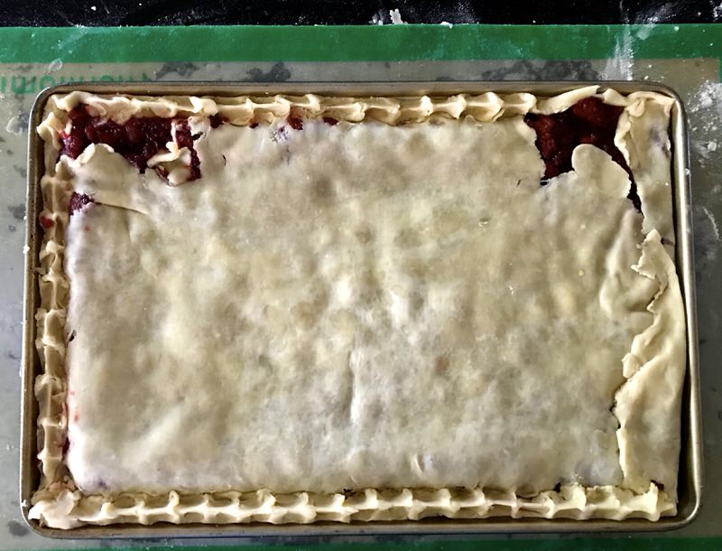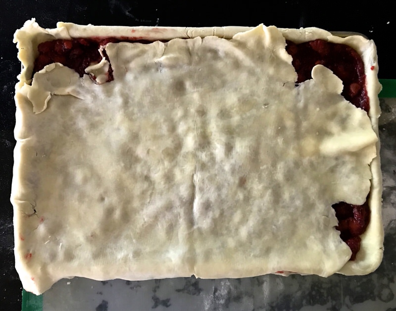 I was worried I didn’t have enough pastry for the top, but it was so close, I was willing to let the pie do its rustic thing. The word “slab” certainly connotates rustic, so I was fine with whatever would be.