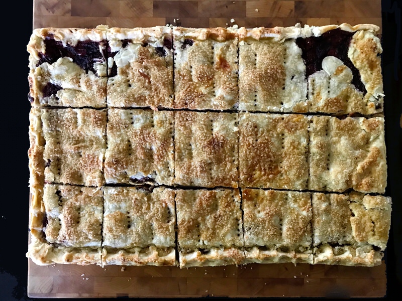 I am addicted! Slab pies have reared their heads the past several years, but I have never met one in real life, but when faced with so many sour cherries still in my freezer with the new cherry season close at hand, I was motivated to give one a go. What a success! Sensational fun hand-pie squares perfect for summer picnics and outdoor festivities.