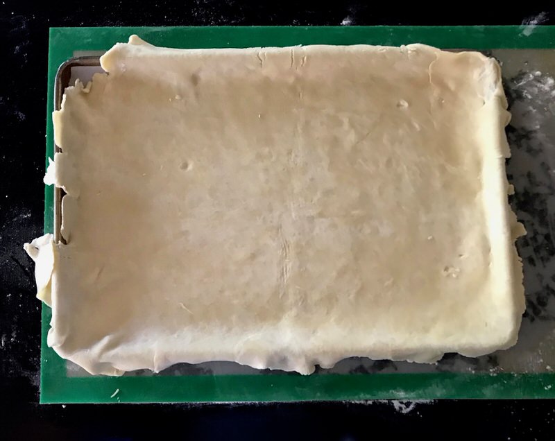 - Roll out 1 ½ discs of pastry dough into 12x18 inch rectangle; transfer to prepared baking pan letting pastry hang over sides