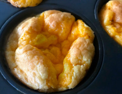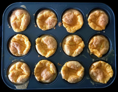 Caution with baking time, however, as these sumptuous bites should be custard-like and moist, not dry and grainy. One minute longer in the oven can affect the taste and texture experience dramatically. Four hundred degrees Fahrenheit promotes a fast rise from the egg accompanied by a silken melt from the cheese. Timing is everything. Most ovens will take 13-14 minutes for the basic egg cup with one ounce of cheese. Less cheese and the addition of aromatics will change that equation.