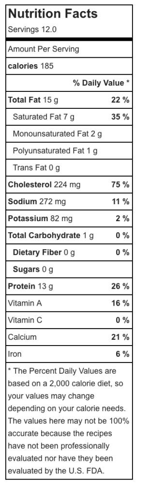 Twelve eggs and twelve ounces or 340 grams of cheddar cheese seasoned with salt and pepper provides a solid base for a cheesy egg cup. However, when starting out, you may want to measure only 1/2 the cheese into the mix so that when you have two egg cups, you are eating only one ounce of cheese with two eggs instead of two. It will be dependent upon your appetite, your program, your schedule and your personal metabolism.
