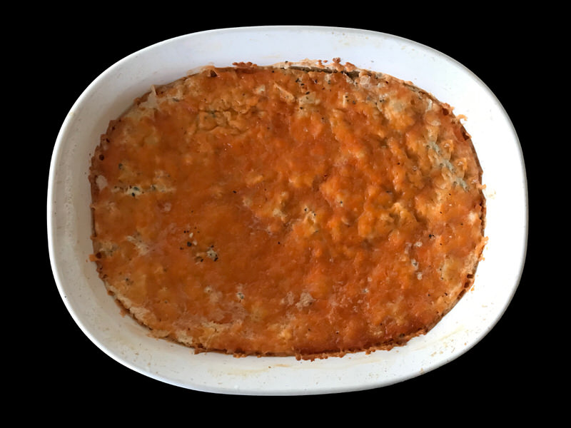 Seafood is strained, drained, patted and pampered, then gently stirred into the mix and topped with more cheesy goodness.