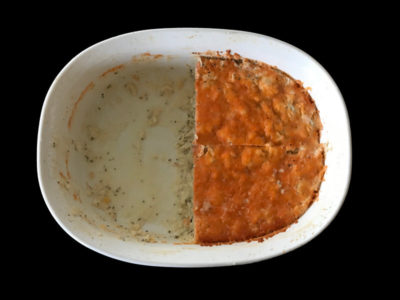 - Cover casserole dish with lid or foil and bake at 350°F for 45 minutes, checking after 30 minutes to ensure centre is baked (springs back to touch)