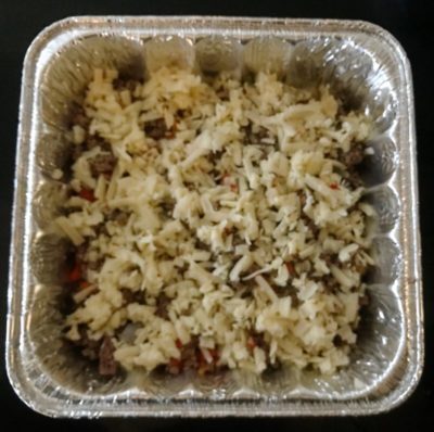 At this point, the filling is very tasty on its own. I have come to make a double batch as a rule in a larger pyrex casserole dish. When I started working with the recipe, however, Ragan and I purchased 9×9 aluminum pans to portion out the batches to freeze and share.