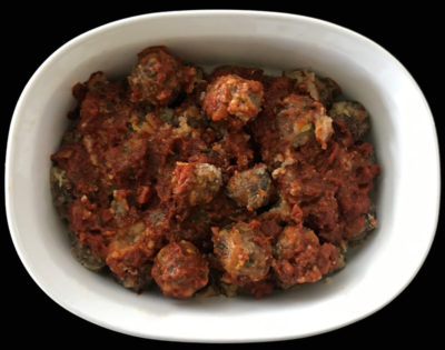 During Project 2019, Ragan and I try to cook together every Tuesday to make healthy, delicious, nutritious Total Reboot Mains for our week. Above, is one batch of this recipe for Ragan to take home. Raw balls in a casserole, above left, then baked for 25 minutes at 400F, above right. There is a great deal of fat from the meat and cheese left in the tray. Don’t drain it off.
