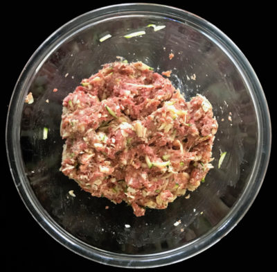Simple tasty ingredients rolled into one: know-your-farmer grass-fed ground beef, organic well-seasoned sausage meat (homemade Spicy Italian Sausage would be delicious), mozzarella cheese, Parmesan cheese, an egg, a cup of shredded zucchini for moisture, dried basil, salt and flaked onion and garlic. The very expensive dried garlic and onion flakes add an unexpected intensity to the seasoning which balances very well with the fatty sausage and cheese.