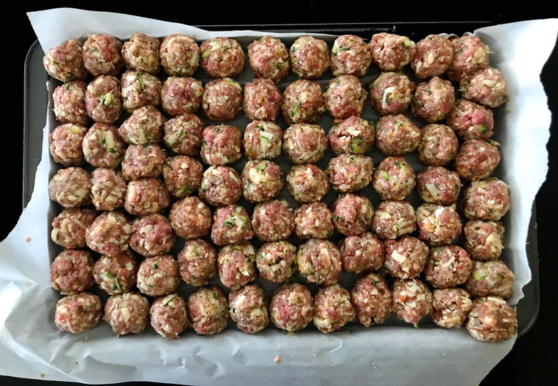 - Form into 40 meatballs; place each on parchment covered sheet pan OR single layer inside 11x15 inch casserole dish