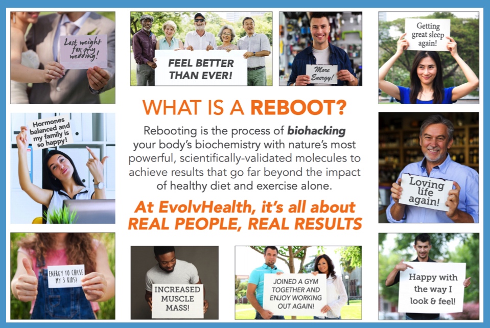 And that’s just the weight part. This is really not about weight loss and weight loss is not a necessary component of the Evolv Health Total Reboot Program. The opportunity is there if you need to lose weight to follow that weight loss path. However, the primary purpose of the program is to reboot your gut health, to rid your body of the pathogens that live in your gut and to revitalize and properly nourish every cell within your physical being so you can be the best version of you.