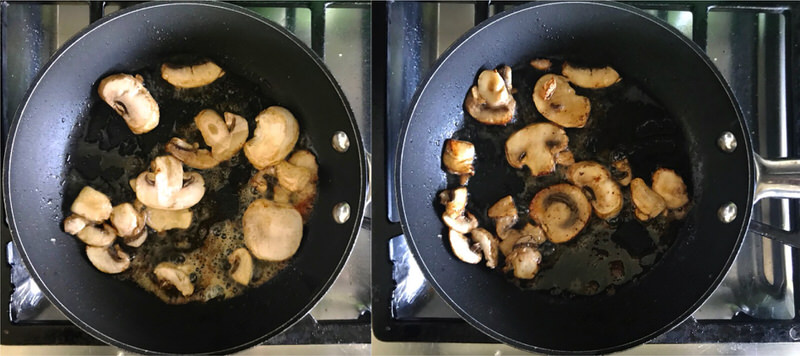 The key is this size of non-stick skillet. It is perfect. Ragan bought it for us. A teaspoon of butter, olive oil, coconut oil, avocado oil: you name the fat. Fry the aromatics until translucent, or mushrooms until browned.