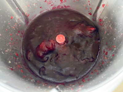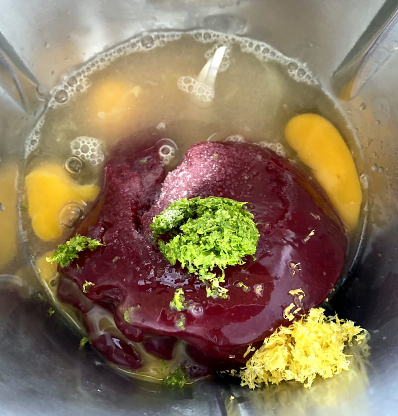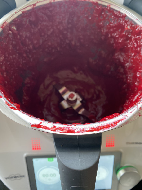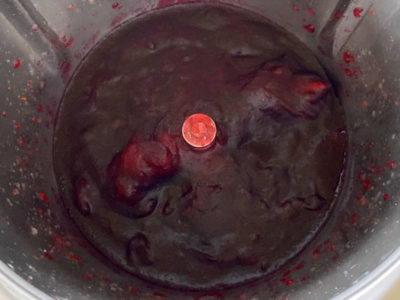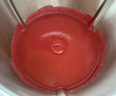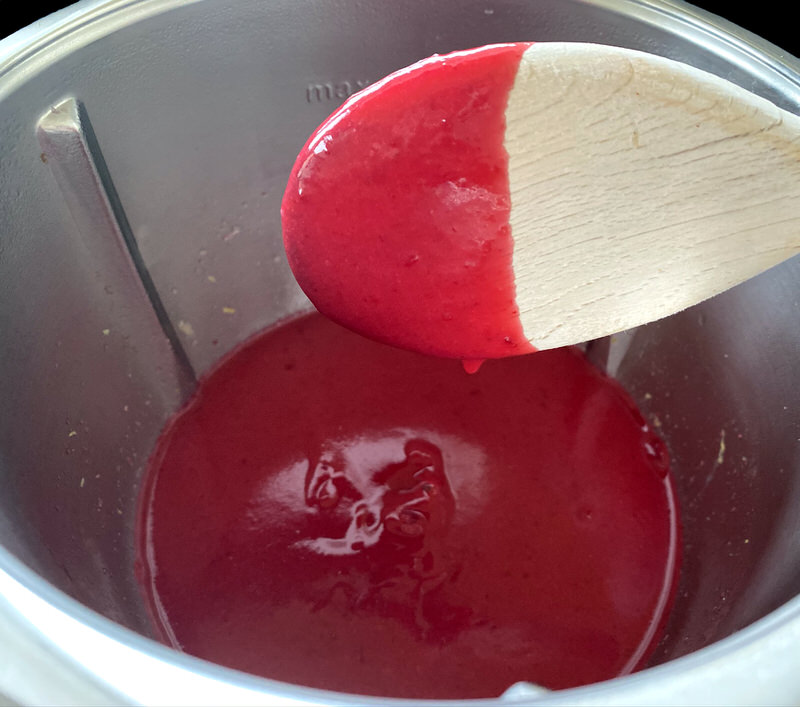 The berries are cooked with water and sugar for 15 minutes at 100˚C on speed Soft, then puréed until glossy, smooth and translucent, as you can see, below. It was intentionally cooked until thick and gelatinous to provide a stable foundation for the curd.