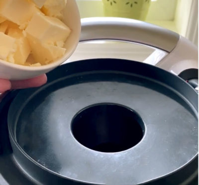- Set time for 5 minutes and speed to 2; add butter through hole in mixing bowl lid over 3-4 minutes, bit, by bit, until fully incorporated
