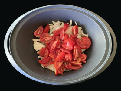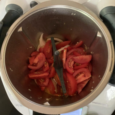 - Add 400 grams of tomatoes and sauté for 3 minutes at 120 ° C on speed soft