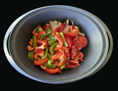 - Place the shellfish and fish, 300 grams of onion, peppers, 400 grams of tomatoes and set aside clams in the Varoma, season with salt and set aside. (My Varoma was packed full so I “dumped” all into a big bowl, tossed to combine and returned to Varoma)