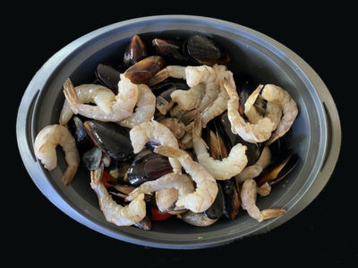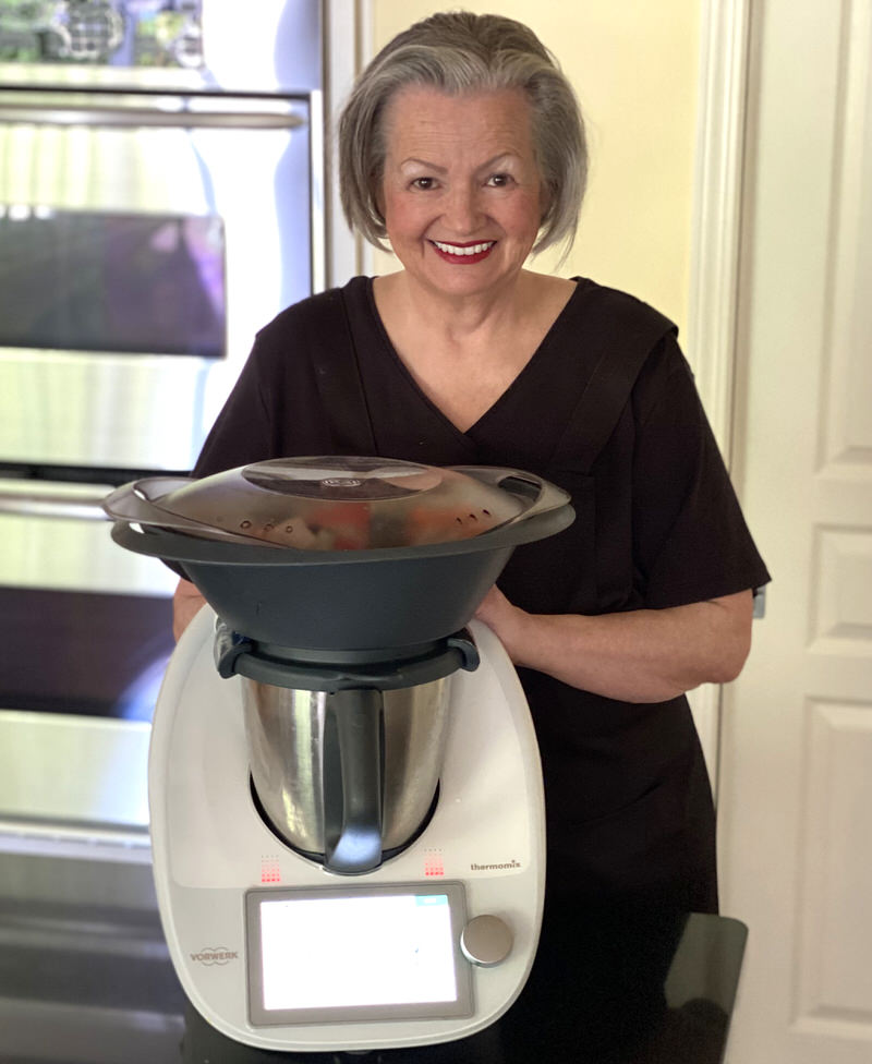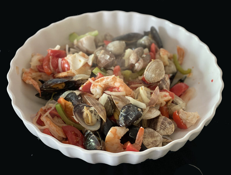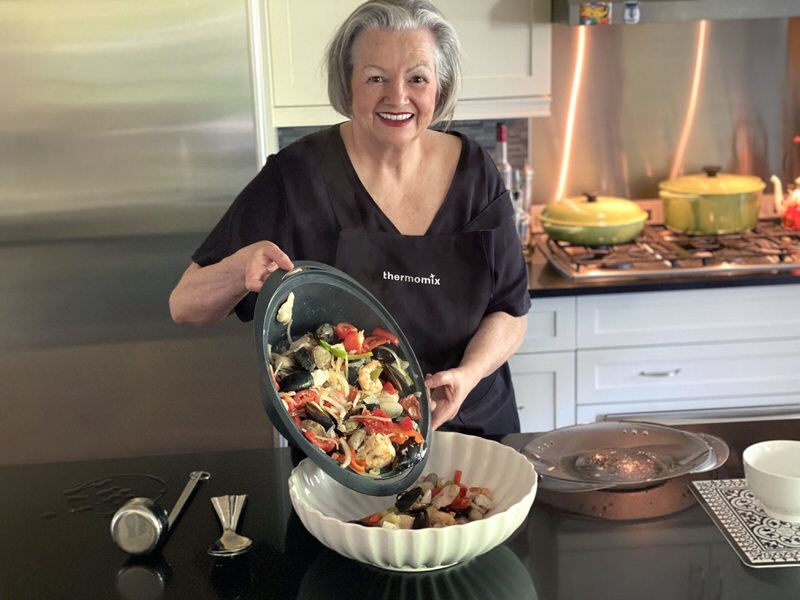 The recipe on Cookidoo® calls for 1000 grams of fish and 400 grams of shellfish, but at my ask and with Elza’s guidance, I came to understand those 1400 grams could be any combination you like. She uses monkfish, mussels, clams and shrimp, but about 1000 grams of the monkfish. I used an equal portion of mussels, clams, shrimp and halibut. Monkfish I will try when I can find it, next time. (400 grams of each) and this amount worked perfectly for me. Elza and I have been presenting “Virtual Cooking Classes” since March 11, 2020, called Cooking with Valza. This was her recipe this week from our Cookidoo® recipe platform here.