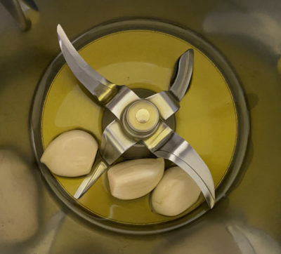 - Place the garlic and oil in mixing bowl and chop for 5 seconds on speed 5, then sauté for 3 minutes at 120 ° C on speed soft