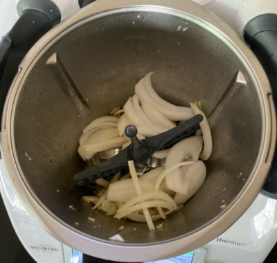 - Insert the butterfly whisk and add 150 grams of onion and sauté for 3 minutes at 120 ° C on speed soft