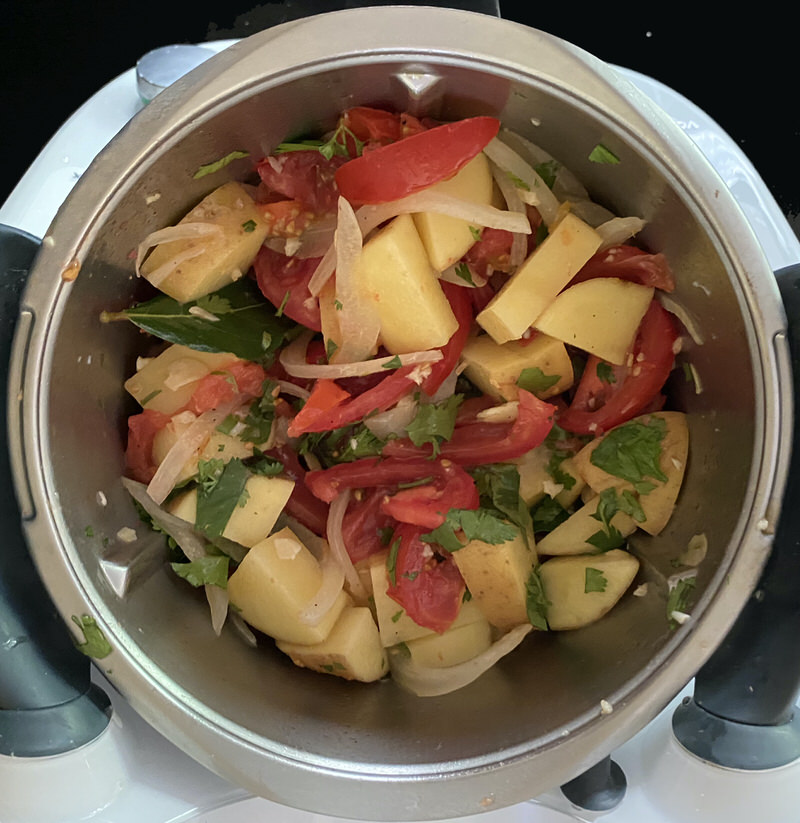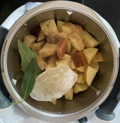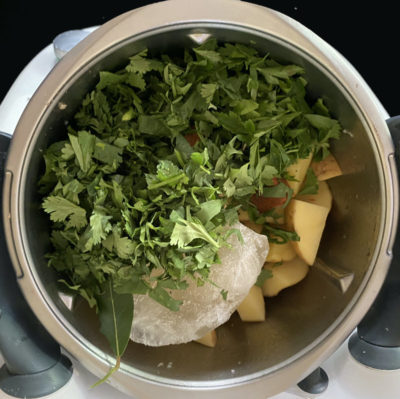 - Remove the butterfly whisk and add the potatoes, stock cubes, wine, water, bay leaf, pepper, cilantro, parsley into mixing bowl (I“dumped” all into a big bowl, tossed to combine and returned to mixing bowl)