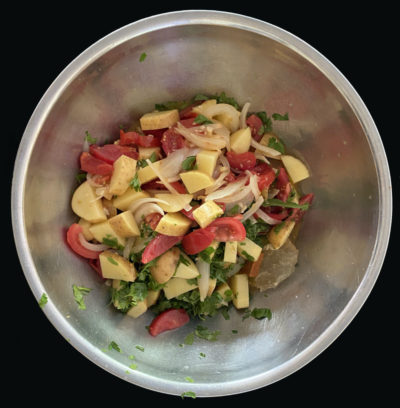 Now for the broth. Same thing, almost. First, the garlic is chopped and sautéd. Then the butterfly whisk is inserted. That was a surprise for me. The sliced onions were sautéd with the whisk in place. As were the tomatoes, that followed. After the aromatics were prepared, the potatoes, wine, seafood bouillon cubes, bay leaves, cilantro and parsley were all weighed into the bowl. Again, I had the same worry. The bowl was very full and though it was going to cook for 35 minutes with a very soft stir, I wanted the ingredients more evenly dispersed, so I “dumped” the ingredients into the big bowl, tossed them, and put them back into the mixing bowl, evenly distributed, for cooking. Filled with anticipation, I waited.