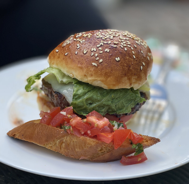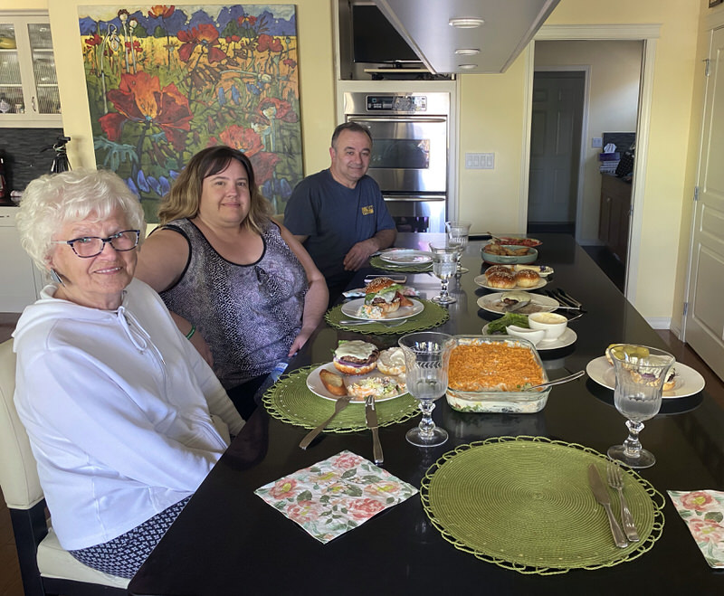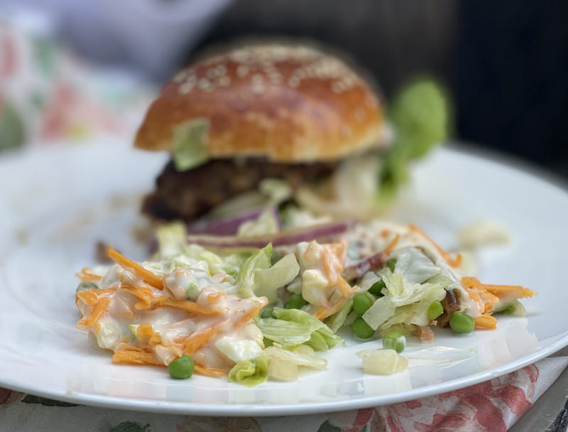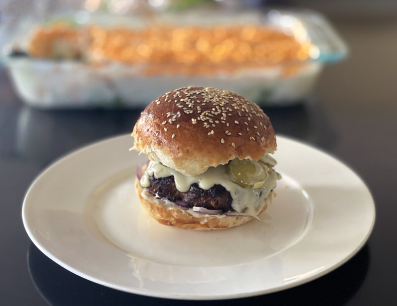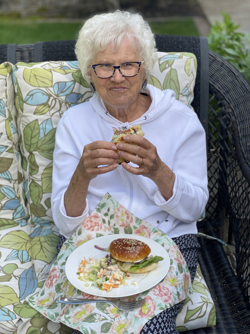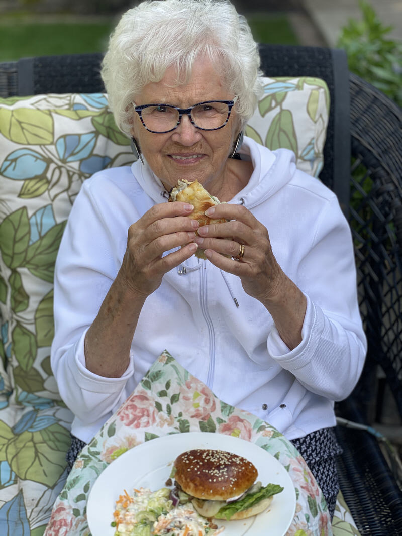 Mom’s burger with her salad. Firsts are always the best, and this first was a celebration of “bursting our isolating bubbles” for safe family members, a celebration of the onset of summer (to come soon) and a celebration of a homemade delicious nutritious casual family dinner. Ah, just being together was so edifying for the soul.