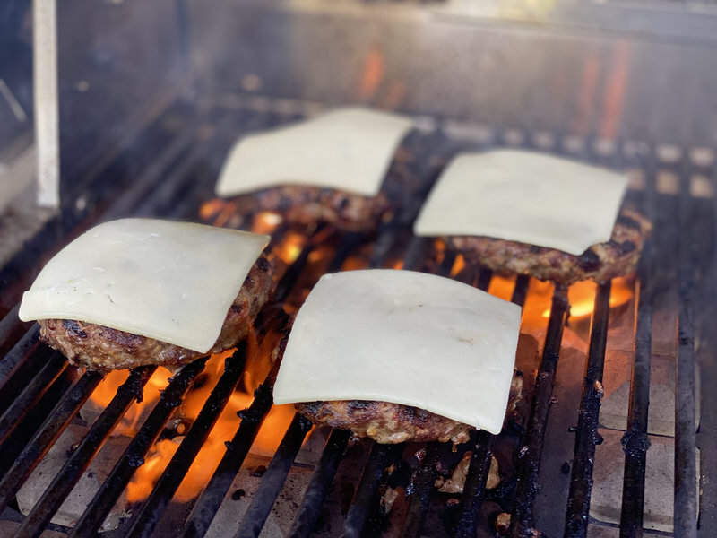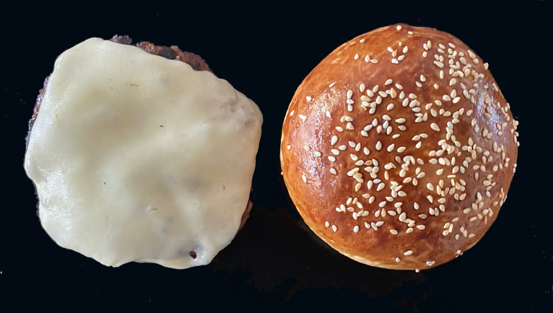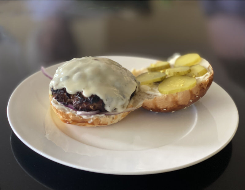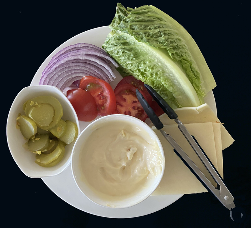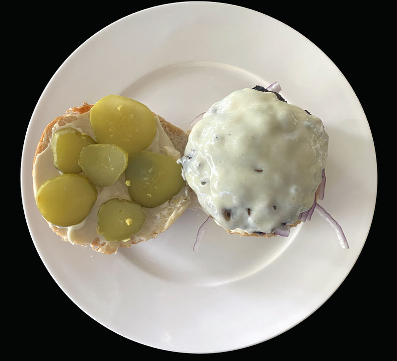 Monterey Jack, it is for me, with lots of onion, extra pickles and mayo. Lettuce and tomato add colour to a photo like orange cheese, but that’s not what I need on my burger.