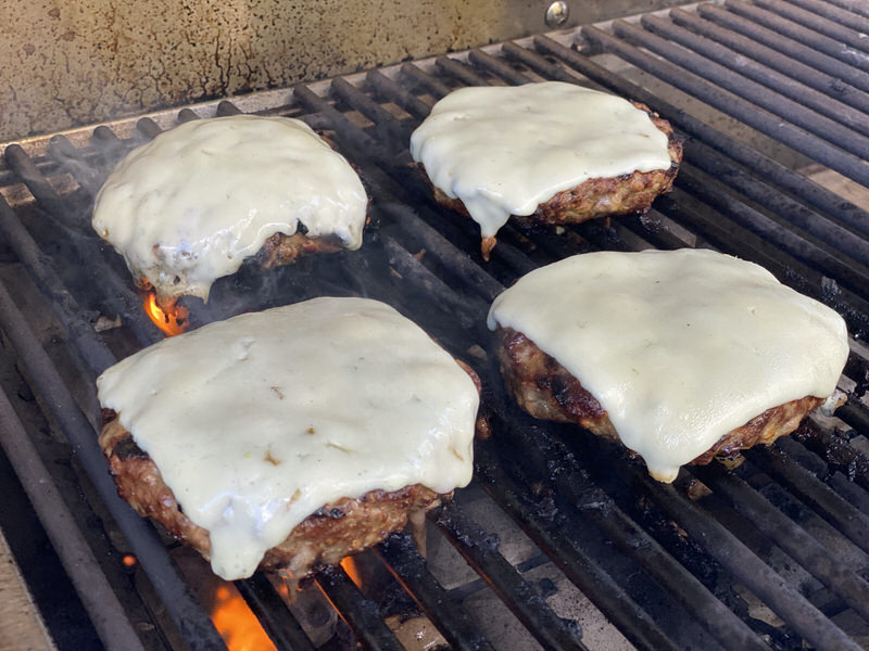 When you buy your ground beef from a farmer you know and a butcher you like, you don’t need to worry about cooking your hamburger until it’s suffered a second death. Lovely, plump and juicy is my goal. Not pink, though. Usually about 4 minutes a side for a burger this big. Two minutes for the grill marks one way (I have a high-heat searing BBQ up to 700 degrees) and flip. Two minutes the other side to get the grill marks, and flip back the other way to get the cross grill marks. Two minutes more, flip and add cheese for the last of the two minutes.
